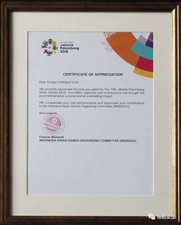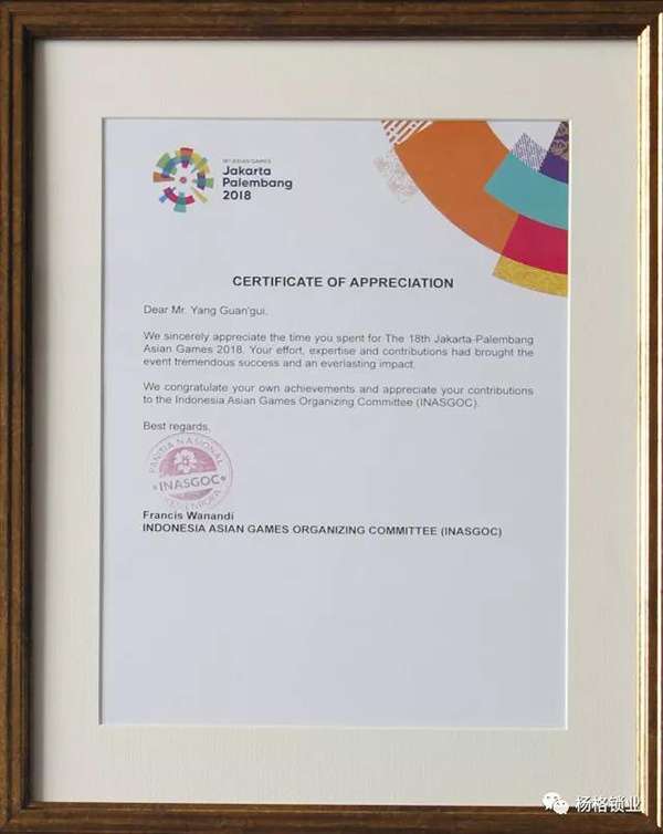 Recently, Mr. Yang Guangui, Chairman of YGS and our company received Appriciation Certificates from the official organizing committee of the 18th Asian Games in Indonesia: