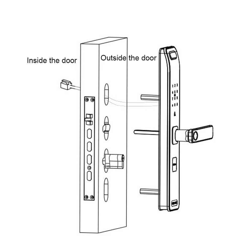 Pass the cable from the door outside into the door. And insert the square bar into the corresponding hole of the lock body. According to the door thickness and scale, cut the square bar, and insert it behind the front panel. Finally, screw the 2 studs and nuts into the back of the front panel to secure them.