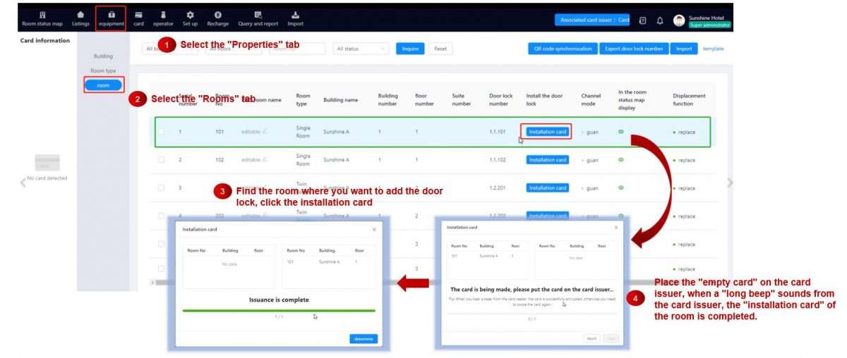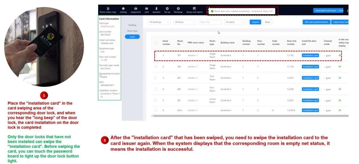- Open the system, select “Room status map” >>> click the room you need to install >>> put the card on the card issuer >>> make the installation card.