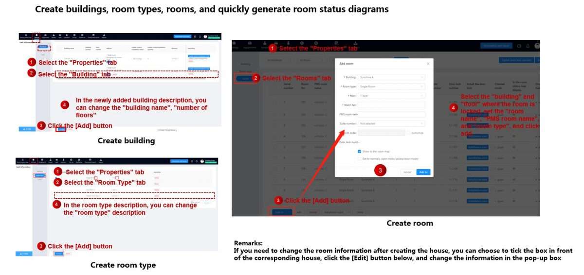 - Create room: Select “Properties” >>> “Room” >>> add a new room, select the “building”, “floor” and “room type” of the room, and set the “room name” >>> “Add”.