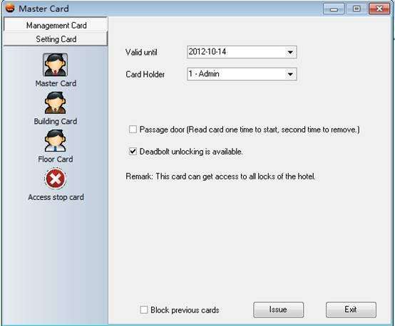 - Special card: Click the menu “Card Management” >>> “Issue Special Card” >>> “Set Card” >>> click the card to be set >>> select the relevant card information >>> put the card on the card issuer and click “Iusse”.