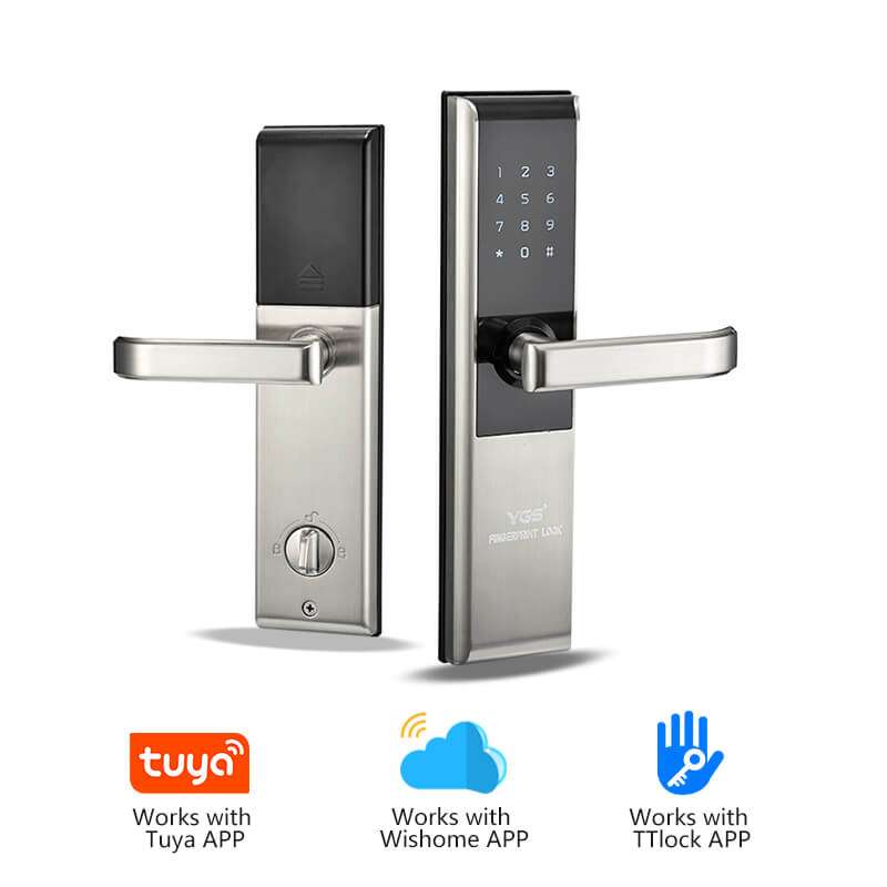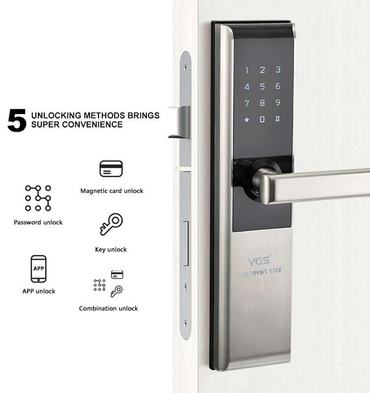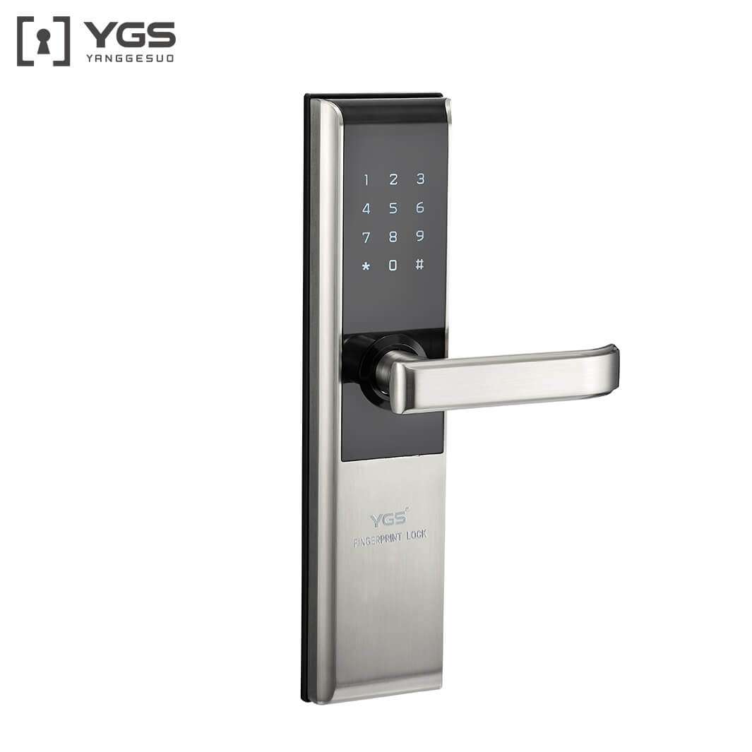 YGS8861 is a fingerprint lock with voice-guided feature, which makes operation very easy and quick. It uses the mechanical anti-theft mortise with one latch and multi security deadbolts, that allows users to lock the door from both indoor and outdoor. Meanwhile, YGS8861 has various approaches to open the door, such as with fingerprint, password, card and key. In urgent situation, you could use mechanical key or USB to unlock. All in all, YGS8861 presents the advanced electromechanical technology, which provides high home security and great convenience.